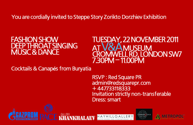 November 23 December 2011 To mark the opening of The Steppe Story, Exhibition by Zorikto, Buryatian celebrities will stage a star-studded concert with performances from Albert Kuvesin, the group leader of unique group Yat-Kha, internationally renowned throat singing punk band from Tuva and Lilya Burdinskaya, dancer and choreographer, author of motion technique based on the interaction of breathing and awareness of oneself in space. A hugely unusual and fascinating fashion show featuring national costumes which were used in the Oscar-nominated film Mongol will take place along Zoriktos paintings on which costumes were based. Mini-film featuring Zoriktos paintings made with artists active participation will be shown during the event and Zorikbook, a new luxuriously illustrated album about artists life and work will be on sale. The spectacular extravaganza will be staged at V&A, one of the Worlds best known museums of Fine Art.