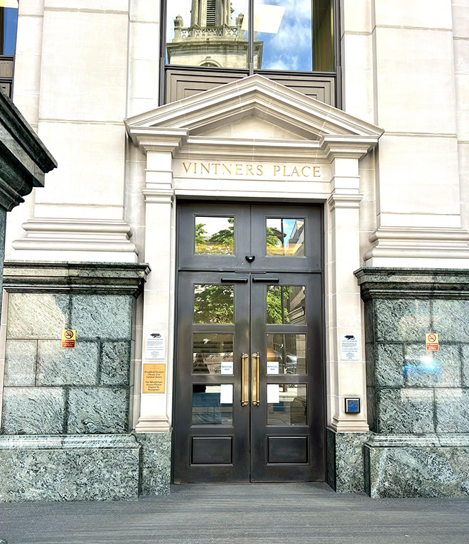 Vintners' Place is a 1980s classical-style office building in the City of London. It faces the Thames and has entrances in Upper Thames Street and Queen Street Place, with the building surrounding Five Kings House and Vintners' Hall. The neighbouring building on the west side is Thames Court, 1 Queenhithe, while on the east side Queen Street Place leads to Southwark Bridge.