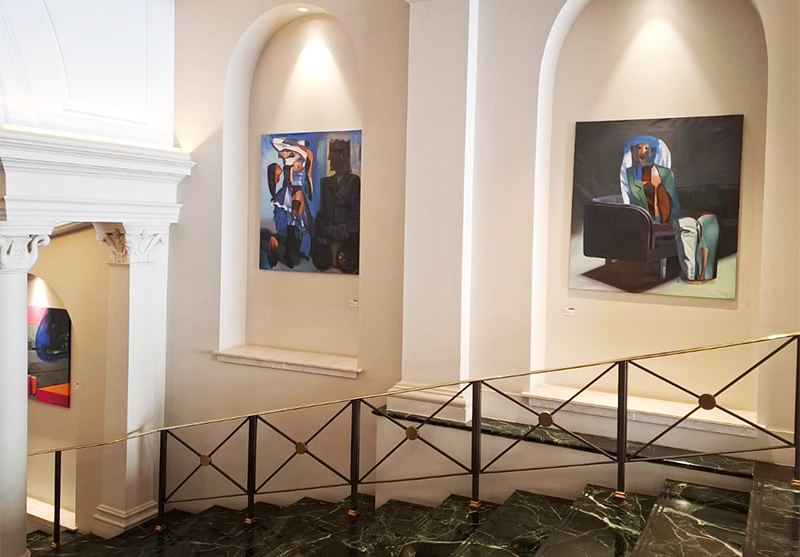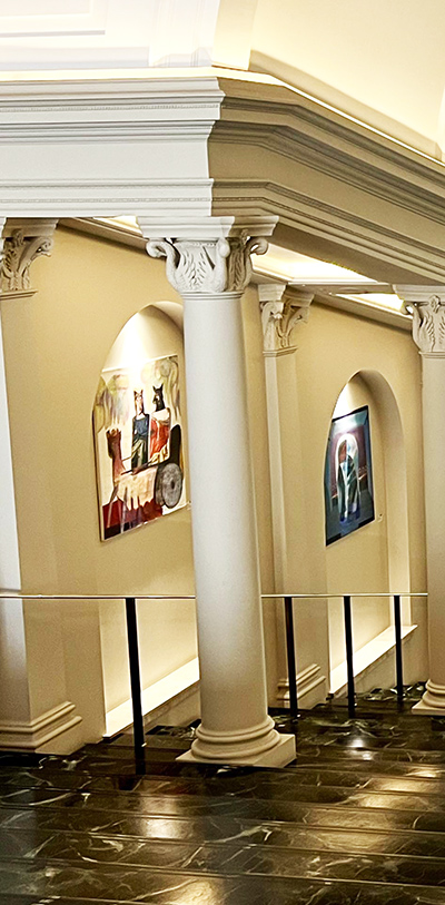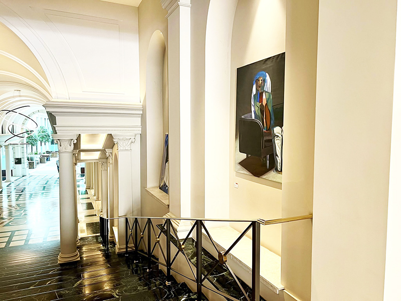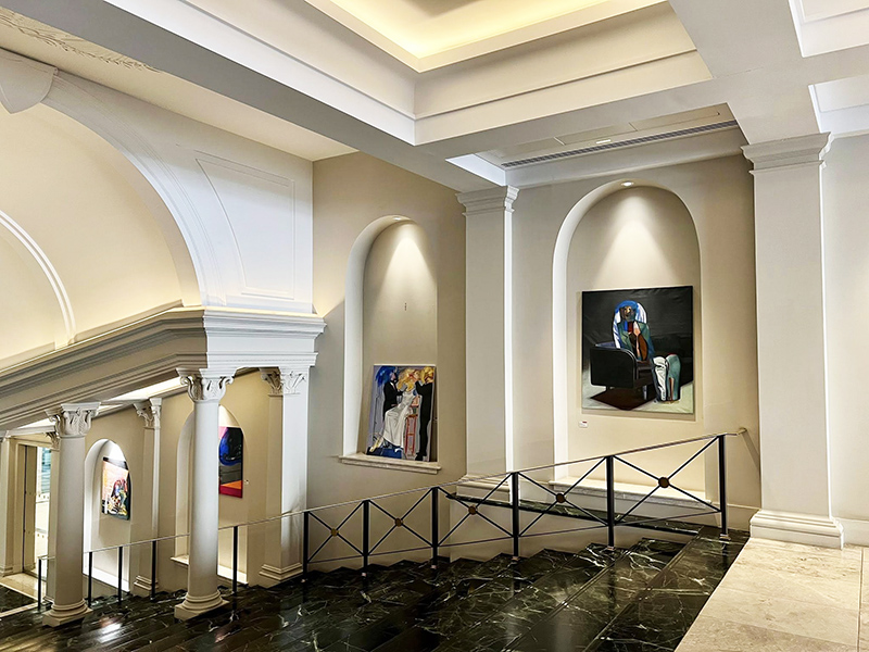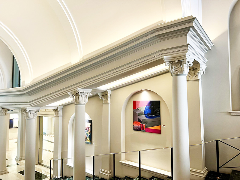 The floors in all the main public areas are in elaborately-patterned marble, echoing motifs from St Peter's and other Roman churches by Bernini. Bands of Estremoz marble frame the patterned areas and help define the architectural and structural grid. The radical design of the Compass Hall revolves around a central sun/compass which highlights the new orientation of the building at this point and directs visitors to the main stairway and the South Gallery. Magnificent stairway inspired by a Bernini original in the Vatican, it leads to the entrance Atrium on the main floor of the Gallery. The marble steps with their carefully-measured height rise between freestanding columns and walls decorated with niches on either side. The Stairway broadens out invitingly as it descends and leads to a hall dominated by succeeding arches accessing the lifts to the north, and then, to the right, runs through the Gallery with its sky-lighted six floors.