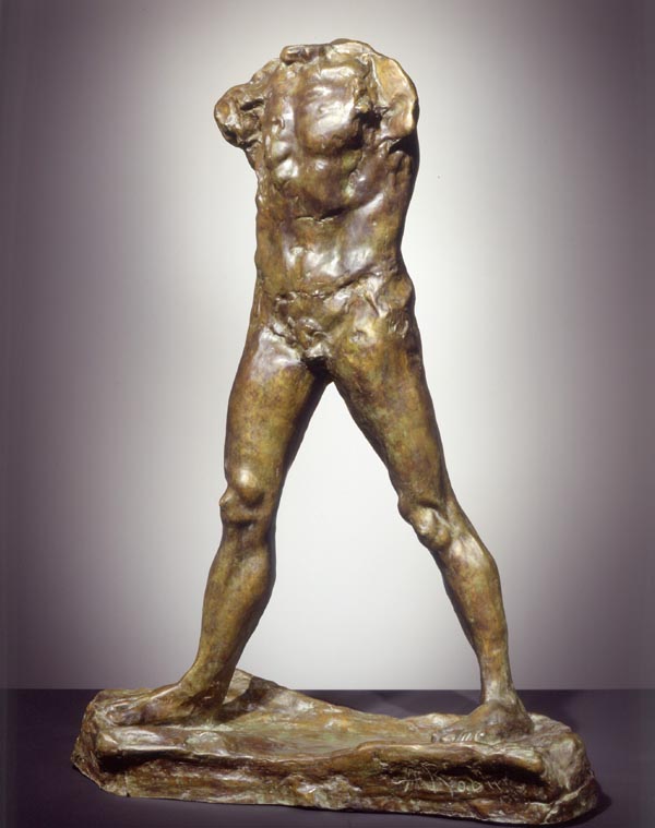 From 1898 to 1906 Rodin made significant modifications to a number of his important sculptures. These changes were concurrent with the translation into marble of his work, occasioned by the massive retrospective Rodin planned to install in his own pavilion for the Universal Exposition of 1900. Such modifications included the enlargement of The Thinker, reductions and casting of The Age of Bronze, and restructuring of St. John the Baptist. The result of the transformation of St. John the Baptist was The Walking Man, a figure, or partial figure, executed in a variety of sizes. Rodin had kept studies related to St. John the Baptist, made in 1877-78, as parts rather than as a complete figure. He reassembled the torso and legs in 1898 but purposefully did not include the arms or head. This elimination of detail and finish emphasized his primary inspiration for the figure, a man who walks. In one version Rodin enlarged The Walking Man to approximately twice its original height; in another he reduced the figure to approximately half its original height.* When cast in bronze or plaster, The Walking Man retained all accidents, blemishes, and unfinished areas of the clay. Rodin emphasized that The Walking Man was a record of making-and unmaking-sculpture, not merely a technical realization of an idea worked out in sculpted human forms. At its largest scale, The Walking Man is the grandest statement of the aesthetic of the fragment that Rodin brought into the twentieth century. Torso (Study for "The Walking Man") is equally dramatic and carries the artist’s ideas of the process of making and subtracting from a figure to their ultimate conclusion. * The impetus to rework St. John the Baptist may originate in Rodin’s casting of a fragmentary torso from the late 1870s, which has been inappropriately titled Torso. |